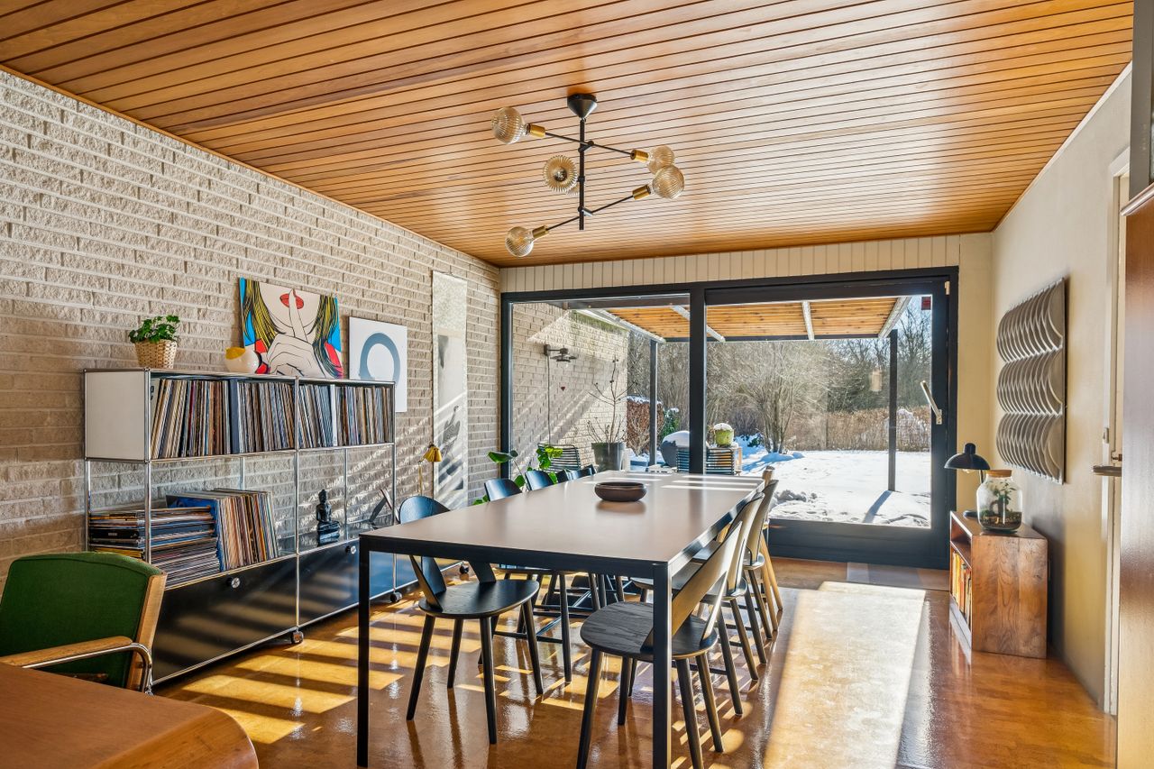 Husets naturlige samlingspunkt er de to stuer, som begge har store vinduespartier mod haven. Her strømmer lyset ind, og der er direkte udgang til overdækket terrasse, så inde- og udeliv smelter sammen. De karakteristiske trælofter og de originale indbyggede skabe understreger husets arkitektoniske identitet og giver boligen en særlig varme og atmosfære.