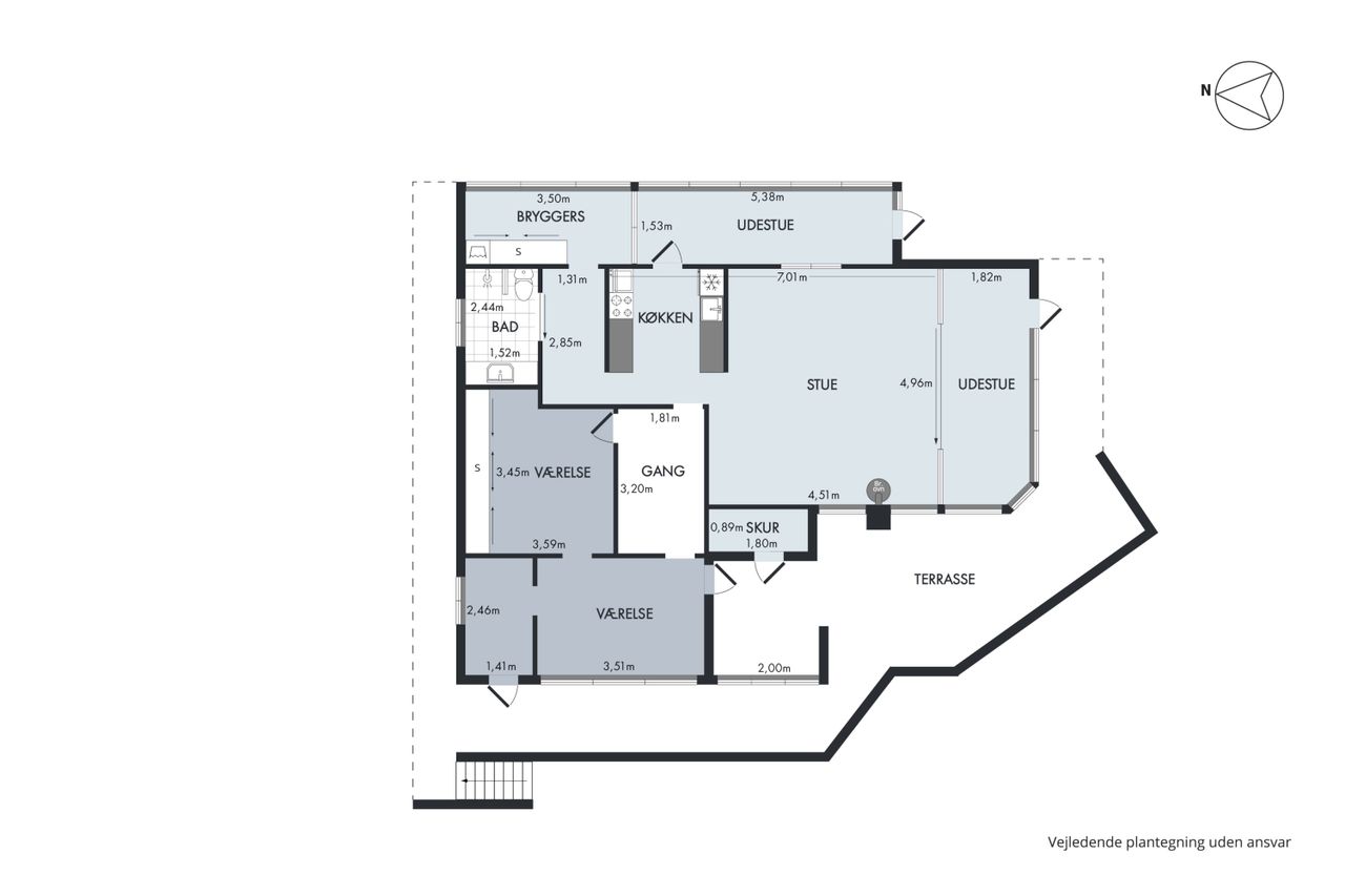 cafebord. Herfra går du ind i køkkenet, der er i åben forbindelse med stuen og den dejlig udestue, der