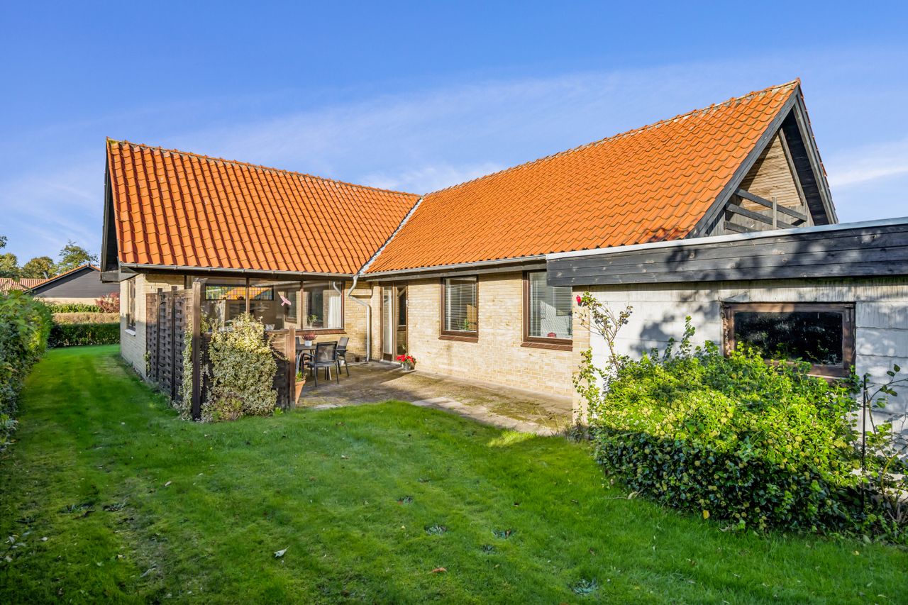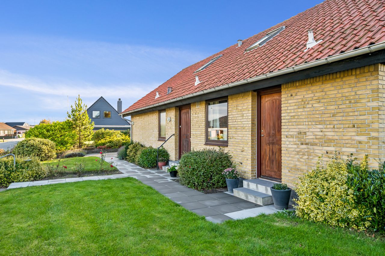 Facaden står med gule mursten, rødt tegltag og mørke gavlpartier, der tilsammen giver et klassisk og harmonisk udtryk.