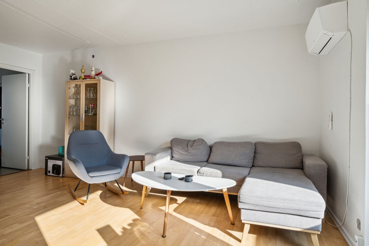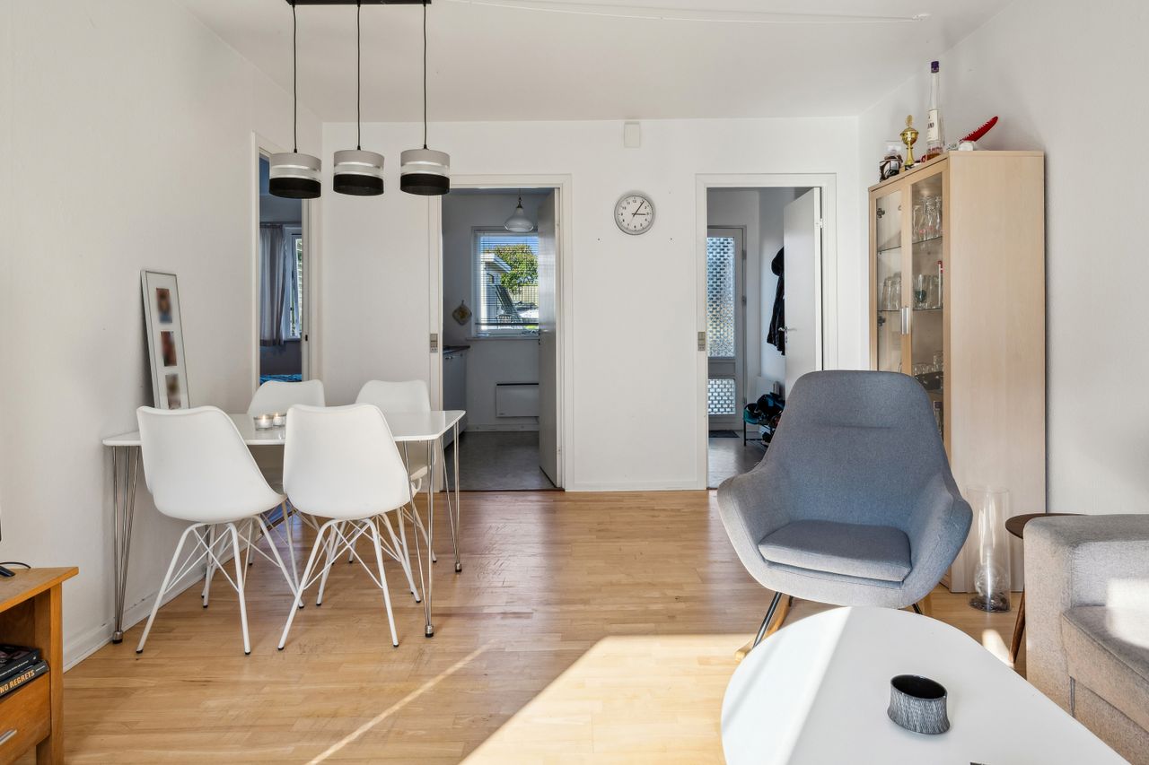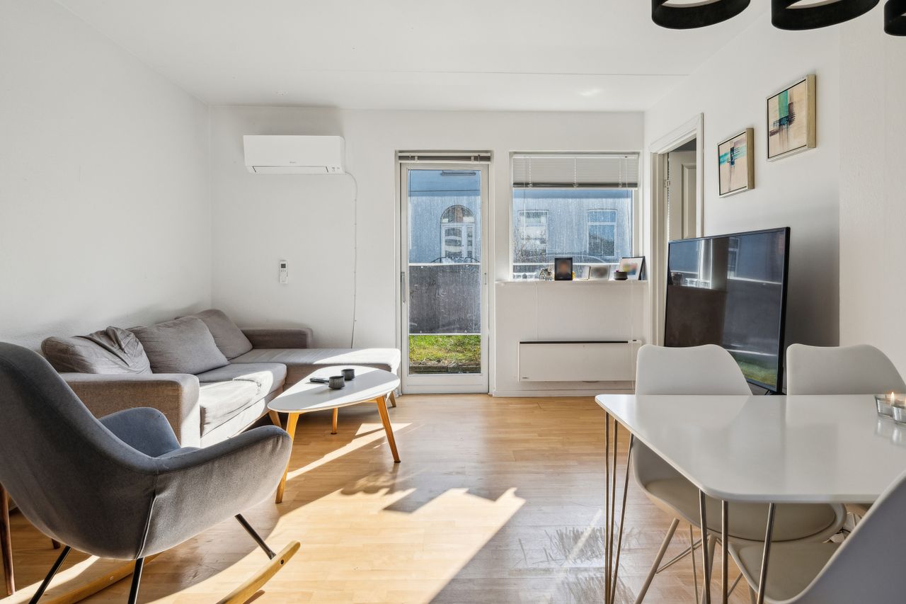 Lejligheden, som er opført i 1977, byder på en god indretning med to værelser, en lys stue med direkte udgang til egen terrasse samt adgang til fælles have. Køkkenet er mindre, men funktionelt, og badeværelset er praktisk indrettet med bruseniche og vaskeinstallation. Boligen opvarmes effektivt med en luft-til-luft varmepumpe.
