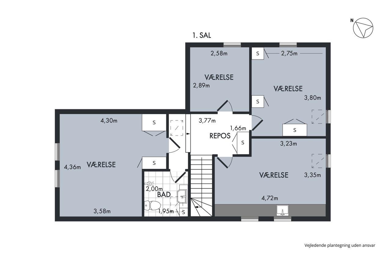godt dagslys over trappen. Her er desuden endnu et badeværelse, så du har bad og toilet på begge