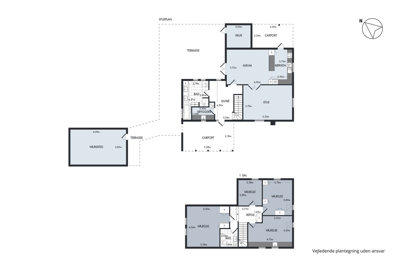 Der er desuden carport og overdække til parkering og brænde samt et udhus.