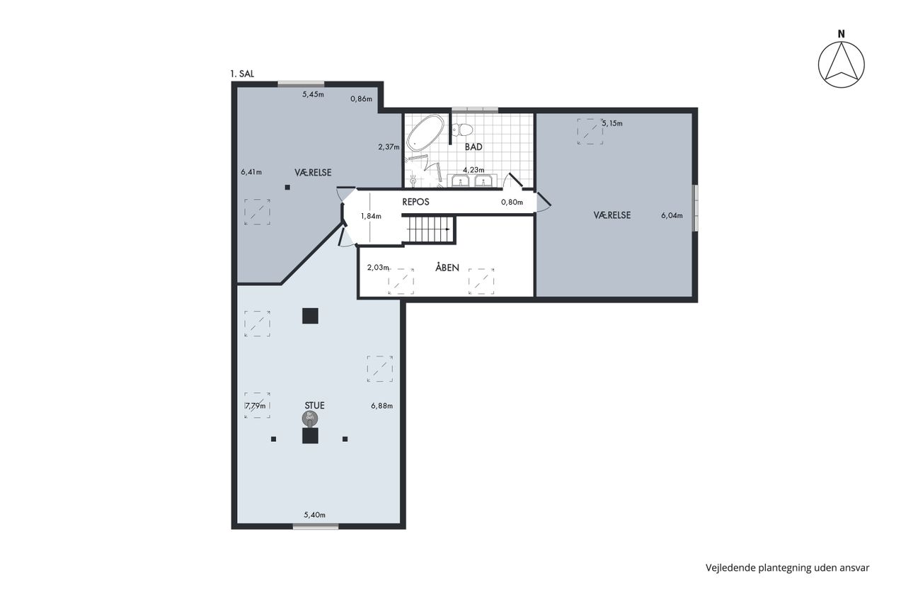 1. sal indeholder iøvrigt en skøn stue og 2 store værelser med smukke synlige hanebånd, der tilføjer