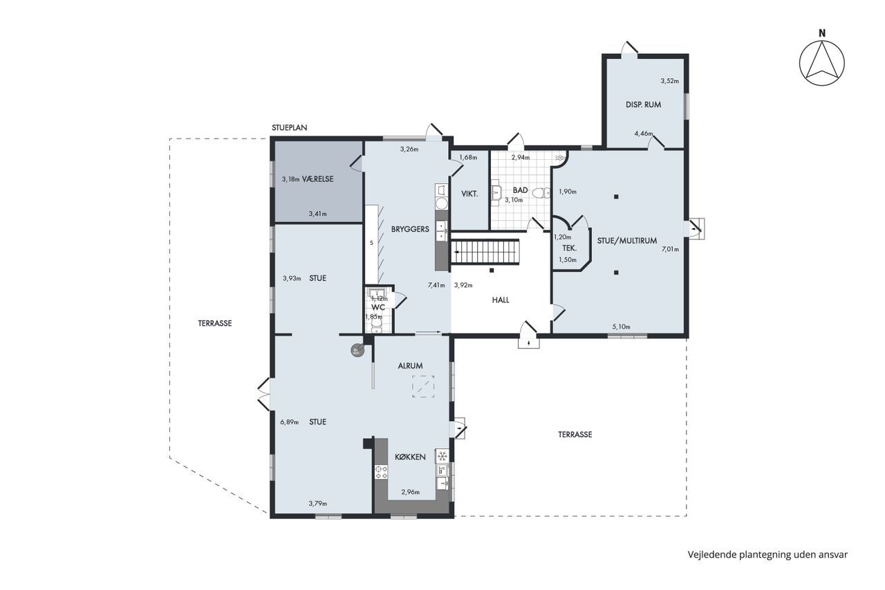 sammenhængende stuer med masser af plads og med udgang til den dejlige vestvendte terrasse,