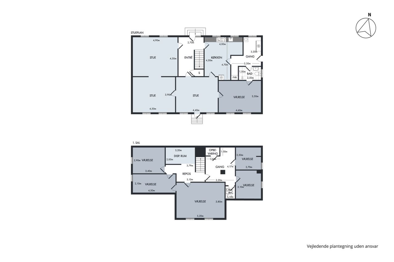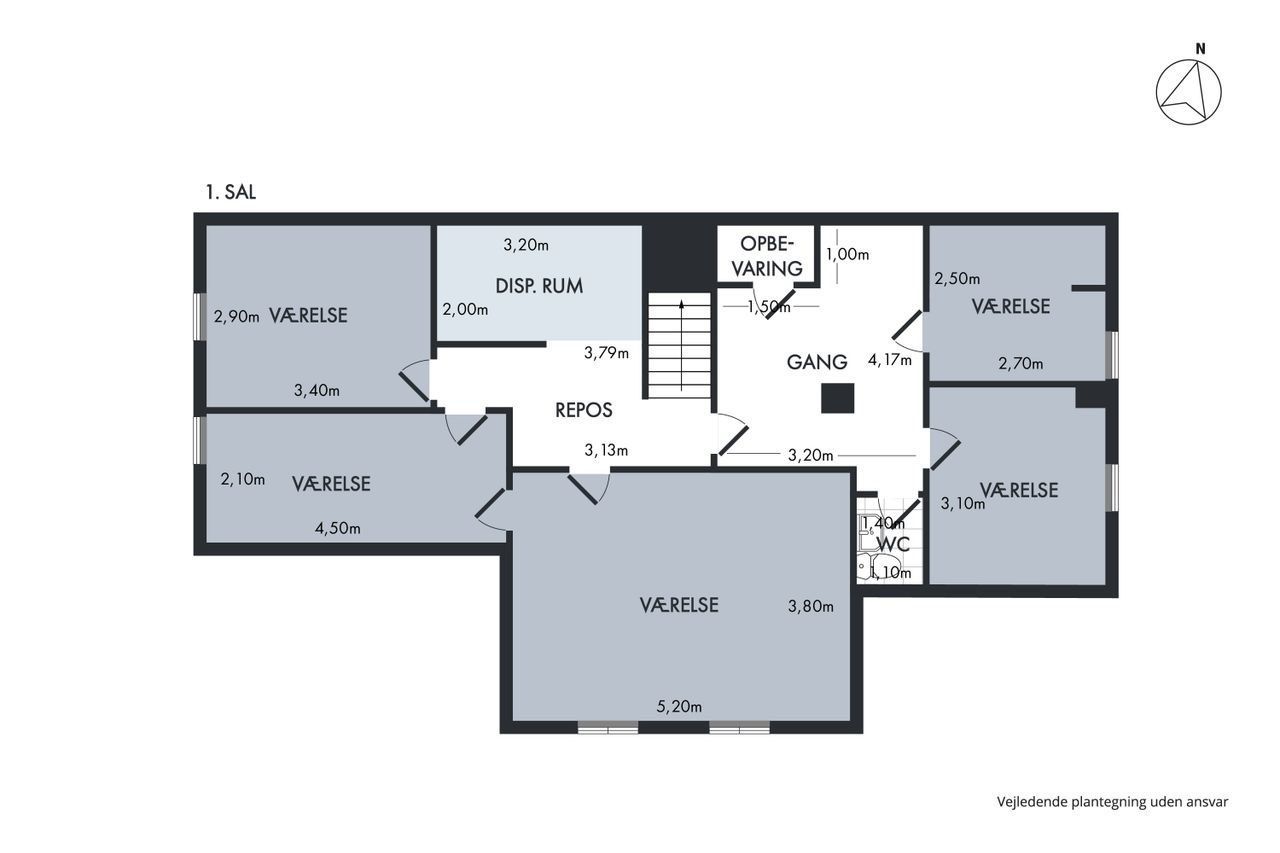 1. sal med repos, 4 værelser og soveværelse. Der er desuden et toilet og et disponibelt rum.