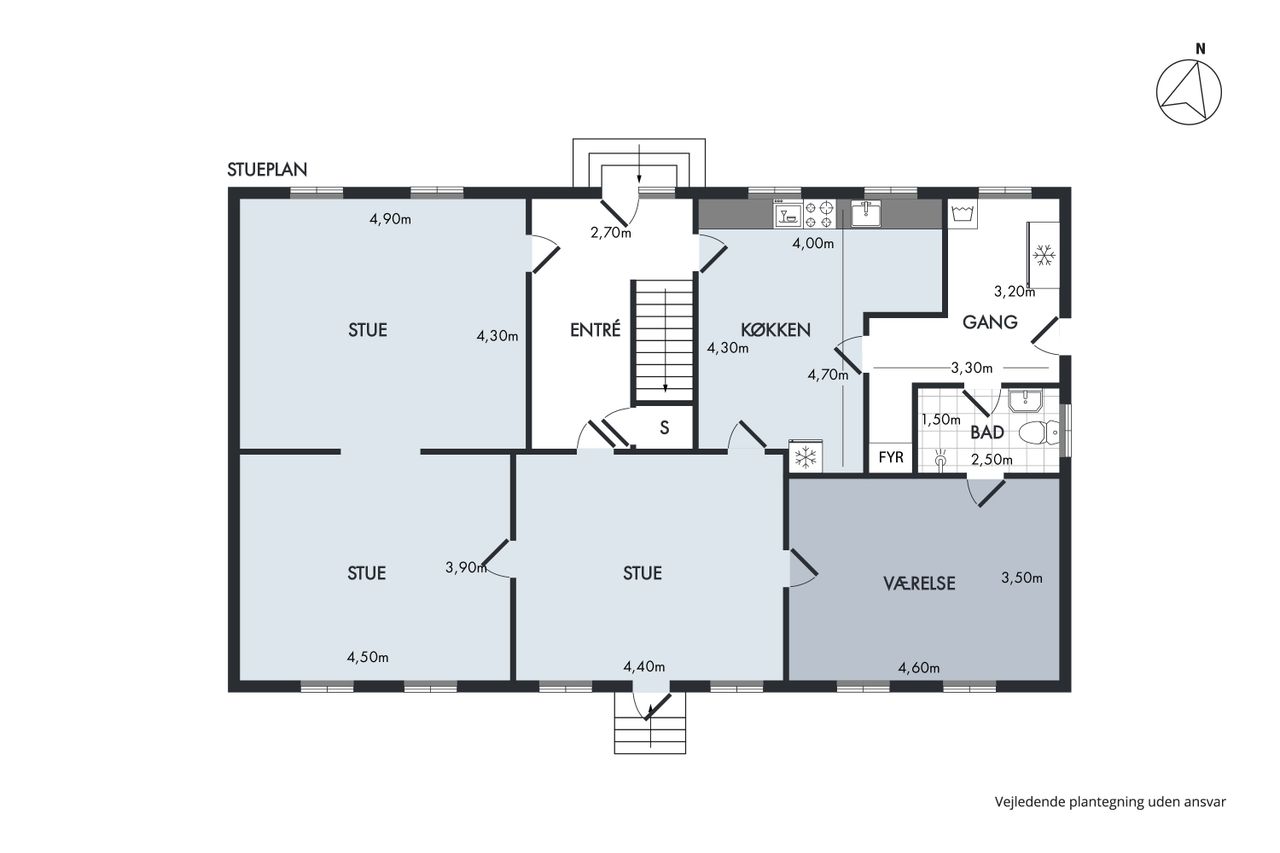 Stuehuset indeholder i stueplan: Entré med flot trappe til 1. sal, spisestue med udgang til sydvendt
