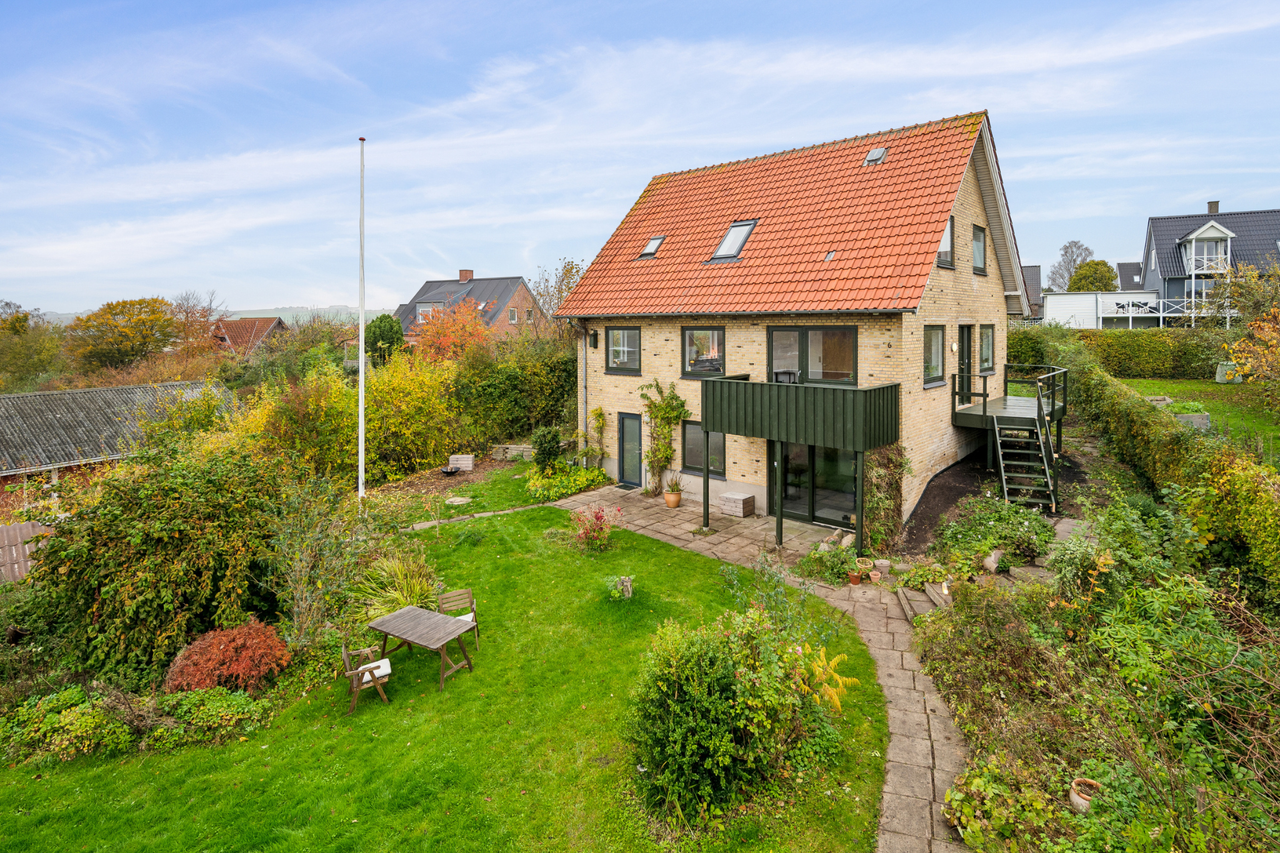 Udelivet får også optimale rammer her, med flere solrige terrasser og altaner, hvor I kan nyde udsigten og roen. Haven er dejlig grøn og fuld af sollys - perfekt til både afslapning og leg, og I har rig mulighed for at indrette hyggelige opholdssteder og udnytte pladsen fuldt ud.